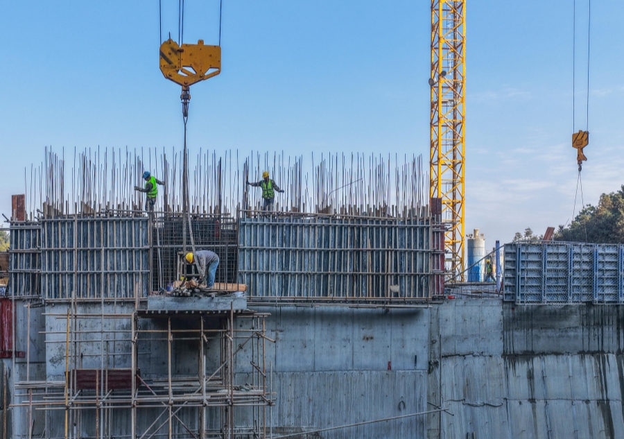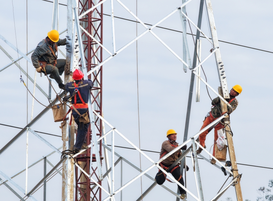 12月15日,嘉禾縣龍?zhí)舵?zhèn)扶塘村,電力工人在110千伏肖麥線工程現(xiàn)場進(jìn)行組塔施工作業(yè)。 黃春濤 攝(湖南圖片庫)