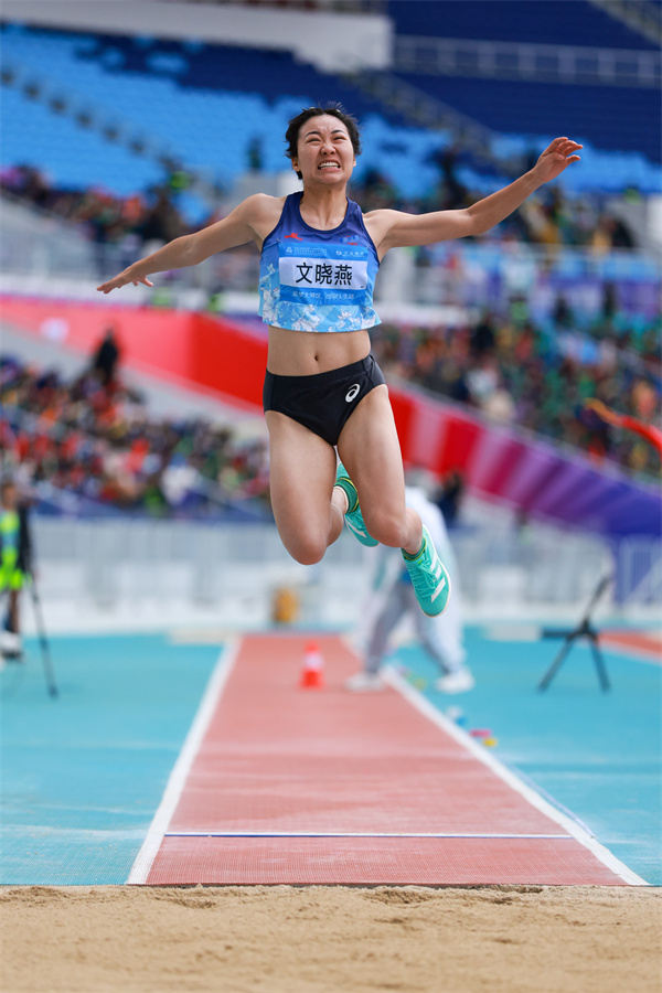 12月14日,在女子跳遠(yuǎn)T37級比賽中,文曉燕奮力一跳。最終,她獲得該項目金牌。