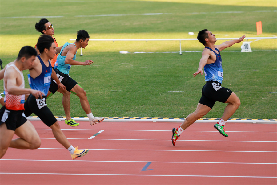 12月9日,在田徑男子100米T12級決賽中,劉衛(wèi)(右一)以11秒13的成績摘下金牌,同場競技的朱乾(左二)以11秒31獲銅牌。