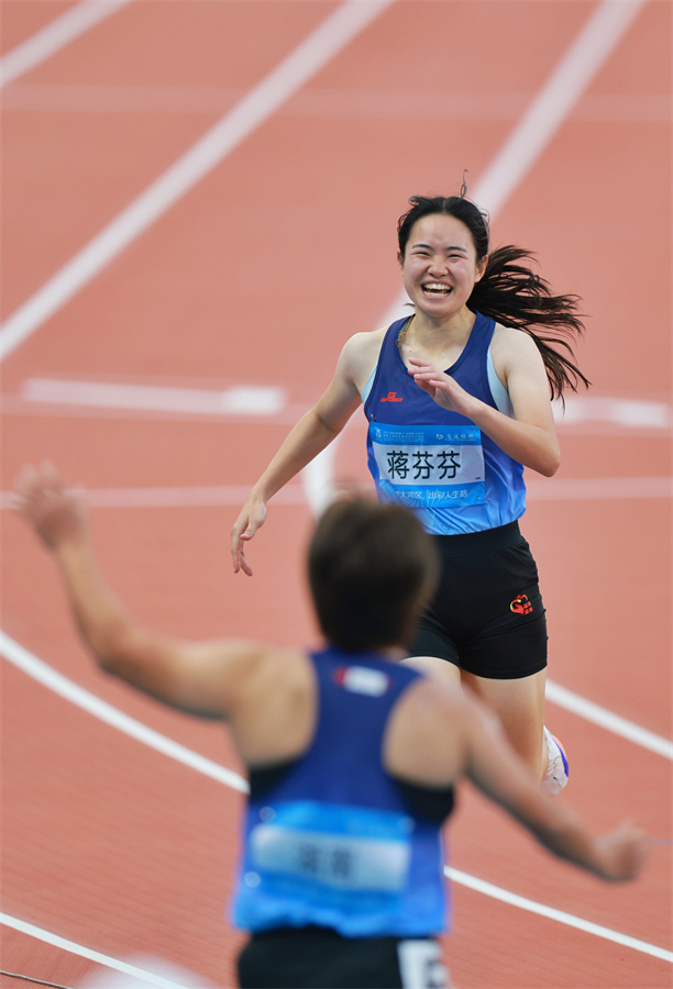12月12日,在田徑女子4×100米T35-38級比賽中,湖南代表隊獲得金牌。圖為完賽后蔣芬芬與周霞一同慶祝。