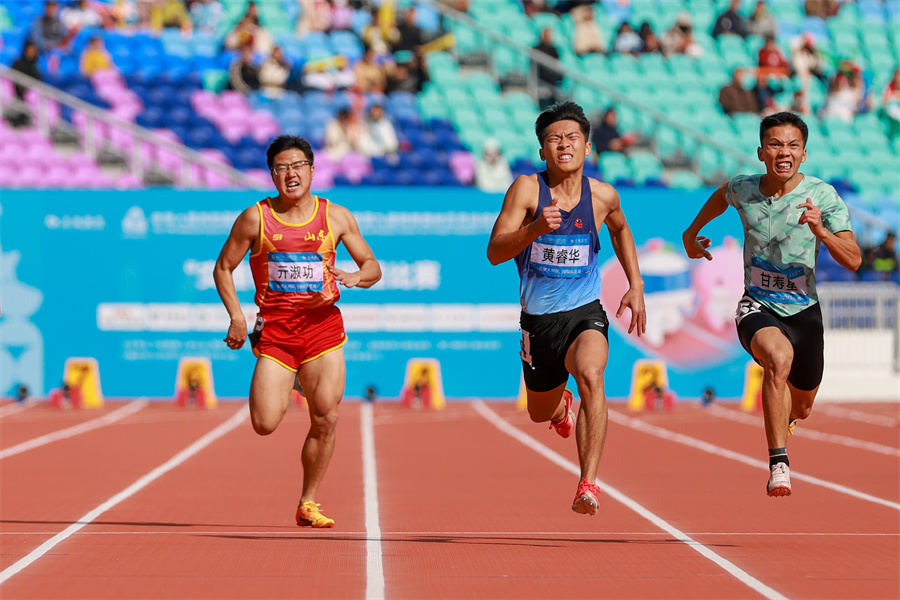 12月14日,黃睿華(中)在田徑男子100米T44級比賽中奮勇爭先,最終獲得銀牌。