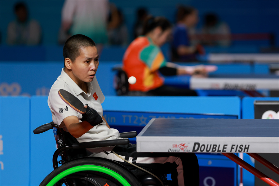 12月11日,乒乓球TT2女子單打小組賽,李霞正在比賽。最終她在女子團(tuán)體和女子雙打比賽中各獲得一枚銅牌。