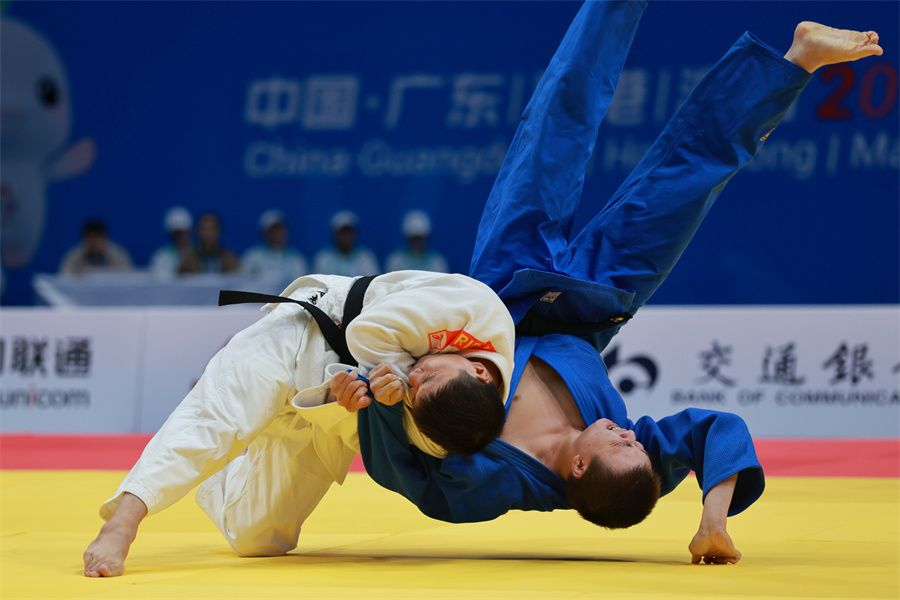12月10日,在盲人柔道男子J1-81公斤級決賽中,29歲的周志偉(白)成功奪金。