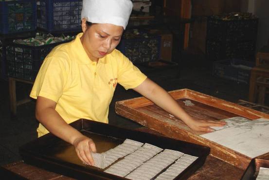 “億昌”麻香糕是中國(guó)糕點(diǎn)食品行業(yè)中工藝較復(fù)雜、加工時(shí)間較長(zhǎng)、工序較多的一種糕點(diǎn);先后經(jīng)過(guò)糯米炒制、制作糕粉、糕粉吸潮、炒芝麻、制麻屑、制泡糖、擦粉、裝盆、壓眉心、打糕、蒸糕、切糕、擺糕、燒糕、齊糕、包裝等十六道主要工序組成(細(xì)分24道)。
