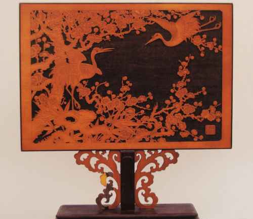 竹簧蝕地縷地雕梅花仙鶴屏