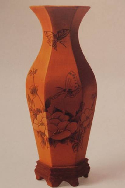 竹簧陰刻填彩六邊形花瓶