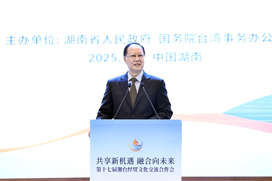 致辭中,毛偉明用“三看”寄語湘臺(tái)合作美好明天。他說,看發(fā)展,湖南已經(jīng)站在新的歷史起點(diǎn)。近年來,湖南錨定“三高四新”美好藍(lán)圖,加快構(gòu)建“4×4”現(xiàn)代化產(chǎn)業(yè)體系,前瞻布局“4+4科創(chuàng)工程”,去年經(jīng)濟(jì)總量達(dá)5.3萬億元。看合作,湘臺(tái)交流取得新的豐碩成果。兩地人緣相親、文緣相承、商緣相通,在湘臺(tái)資項(xiàng)目累計(jì)達(dá)3223個(gè)、臺(tái)企超700家、投資規(guī)模超千億元;臺(tái)灣已成為湖南入境游第二大客源地、雙向旅客超500萬人次,超10萬臺(tái)胞來炎帝陵尋根謁祖。看未來,湘臺(tái)合作迎來新的歷史機(jī)遇。希望雙方以本屆大會(huì)為新起點(diǎn),深化產(chǎn)業(yè)鏈供應(yīng)鏈技術(shù)鏈對(duì)接融合,推動(dòng)全面恢復(fù)湘臺(tái)直航和各領(lǐng)域貿(mào)易合作,加強(qiáng)根祖文化、抗戰(zhàn)文化、民俗文化、非遺等領(lǐng)域交流,攜手塑造產(chǎn)業(yè)合作的示范地、暢通貿(mào)易往來的共贏路、架好民間交往的連心橋。
