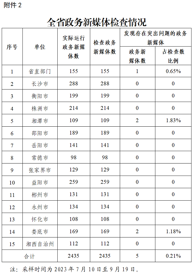 對全省正常運行的2435家政務(wù)新媒體進行普查,發(fā)現(xiàn)5家存在突出問題,總體合格率為99.79%。長沙市、衡陽市、株洲市、邵陽市、岳陽市、常德市、張家界市、益陽市、郴州市、永州市、懷化市、湘西自治州政務(wù)新媒體檢查合格率100%。