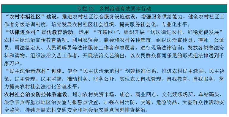 194.強(qiáng)化法治保障。各級(jí)黨委和政府要善于運(yùn)用法治思維和法治方式推進(jìn)鄉(xiāng)村振興工作,嚴(yán)格執(zhí)行現(xiàn)行涉農(nóng)法律法規(guī),在規(guī)劃編制、項(xiàng)目安排、資金使用、監(jiān)督管理等方面,提高規(guī)范化、制度化、法治化水平。完善鄉(xiāng)村振興法規(guī)制度,充分發(fā)揮立法在鄉(xiāng)村振興中的保障和推動(dòng)作用,推動(dòng)各類(lèi)組織和個(gè)人依法依規(guī)實(shí)施和參與鄉(xiāng)村振興。