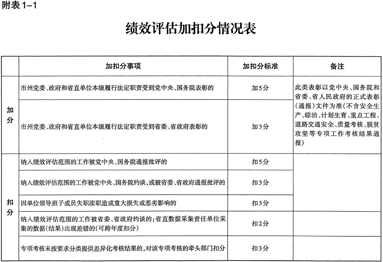 2.加分與扣分。加扣分的具體情形和標(biāo)準(zhǔn)(見《績效評估加扣分情況表》)(附表1—1)。市州和省直單位存在加分事項(xiàng)的,須在2018年1月10日前向省績效辦申報(bào),由省績效辦審核決定;1月10日以后申報(bào)的計(jì)入下年度績效評估。