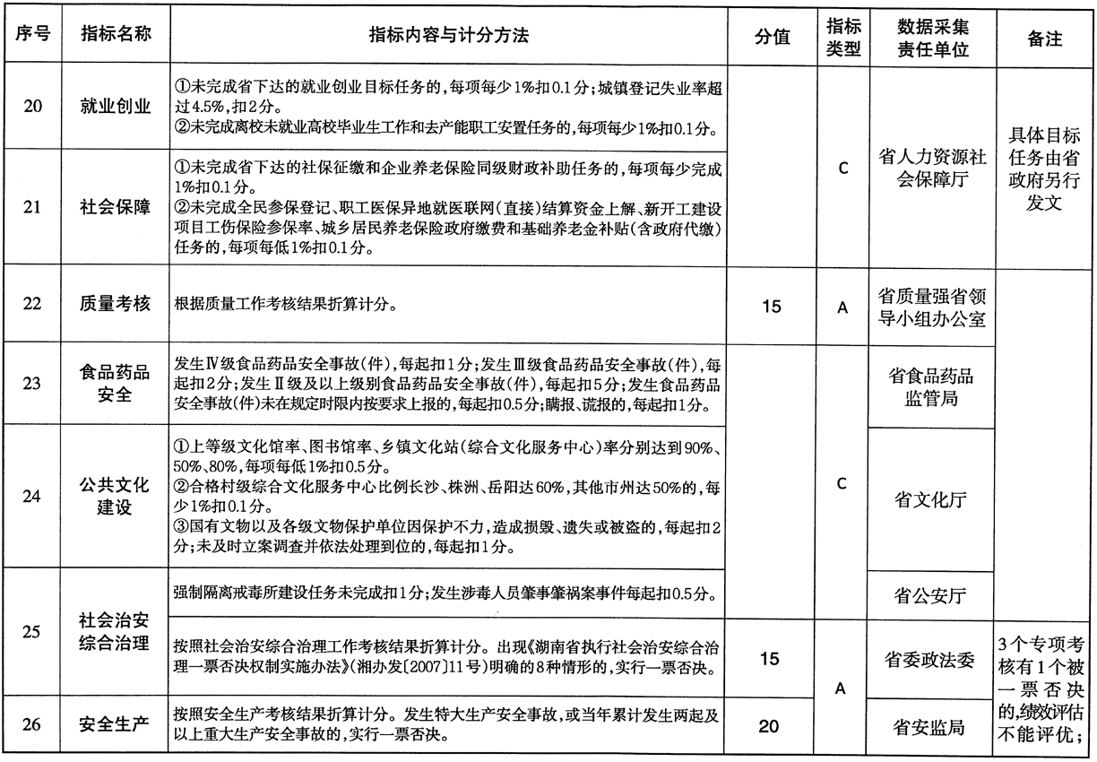 (四)不合格等次:有下列情形之一的單位,經(jīng)省績效評估委員會研究并報(bào)省委、省人民政府審定后,認(rèn)定為不合格等次:安全生產(chǎn)、社會治安綜合治理、計(jì)劃生育有兩項(xiàng)及以上被一票否決的;因工作失職瀆職造成重大損失或惡劣影響的。