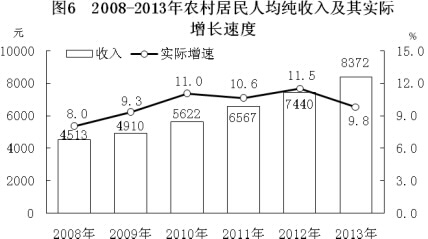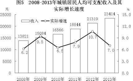 全省城鎮(zhèn)居民人均可支配收入23414元,比上年增長9.8%;扣除價(jià)格因素,實(shí)際增長7.0%;農(nóng)村居民人均純收入8372元,增長12.5%;扣除價(jià)格因素,實(shí)際增長9.8%。城鎮(zhèn)居民人均消費(fèi)性支出15887元,增長8.7%;農(nóng)村居民人均生活消費(fèi)支出6609元,增長12.6%。城鎮(zhèn)居民食品消費(fèi)支出占消費(fèi)總支出的比重(恩格爾系數(shù))為35.1%,農(nóng)村為38.4%。