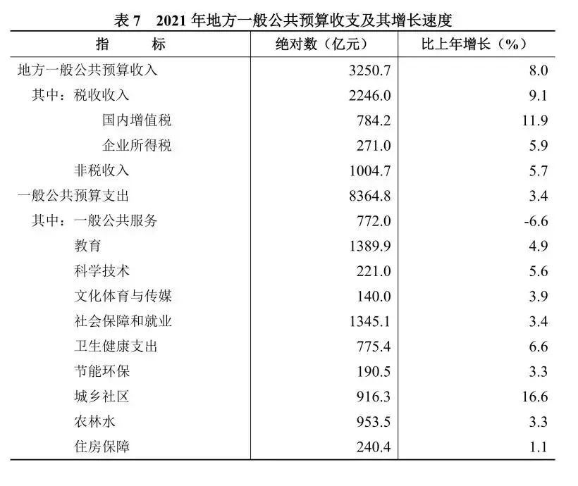 全年地方一般公共預(yù)算收入3250.7億元,比上年增長8.0%。其中,稅收收入2246.0億元,增長9.1%;非稅收入1004.7億元,增長5.7%。稅收收入中,國內(nèi)增值稅784.2億元,增長11.9%;企業(yè)所得稅271.0億元,增長5.9%。一般公共預(yù)算支出8364.8億元,增長3.4%。其中,教育支出1389.9億元,增長4.9%;社會(huì)保障和就業(yè)支出1345.1億元,增長3.4%;衛(wèi)生健康支出775.4億元,增長6.6%;科學(xué)技術(shù)支出221.0億元,增長5.6%;住房保障支出240.4億元,增長1.1%。