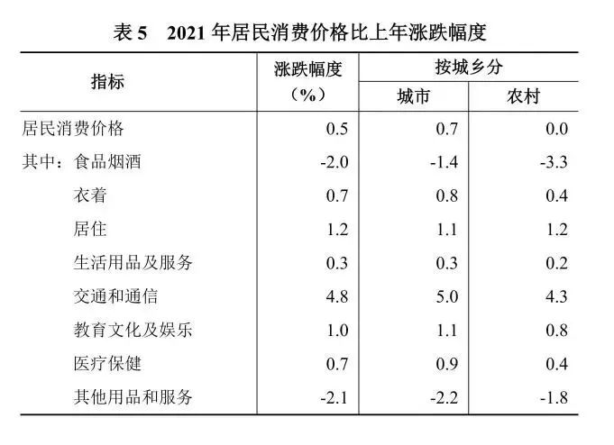全年居民消費(fèi)價(jià)格比上年上漲0.5%。其中,城市上漲0.7%,農(nóng)村與上年持平。商品零售價(jià)格上漲1.6%。工業(yè)生產(chǎn)者出廠價(jià)格上漲5.9%,工業(yè)生產(chǎn)者購進(jìn)價(jià)格上漲8.1%。農(nóng)產(chǎn)品生產(chǎn)者價(jià)格下跌9.9%。