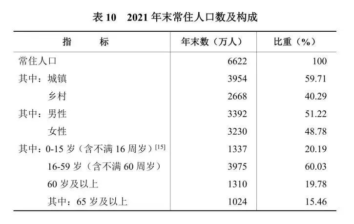 [15]2021年末,全省0-14歲(含不滿15周歲)人口為1249萬人,15-59歲(含不滿60周歲)人口為4063萬人。