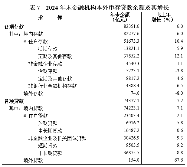 年末金融機(jī)構(gòu)本外幣各項(xiàng)存款余額82351.6億元,比上年末增長(zhǎng)6.0%。其中,住戶存款余額51673.3億元,增長(zhǎng)10.4%;非金融企業(yè)存款余額14540.3億元,增長(zhǎng)1.1%。本外幣各項(xiàng)貸款余額74377.1億元,增長(zhǎng)7.2%。其中,住戶貸款余額23403.4億元,增長(zhǎng)2.1%;非金融企業(yè)及機(jī)關(guān)團(tuán)體貸款余額50426.9億元,增長(zhǎng)9.3%。