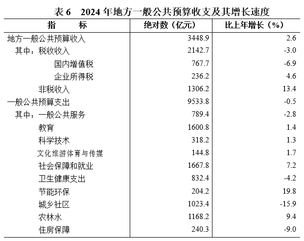 全年地方一般公共預(yù)算收入3448.9億元,比上年增長(zhǎng)2.6%。其中,稅收收入2142.7億元,下降3.0%;非稅收入1306.2億元,增長(zhǎng)13.4%。稅收收入中,國內(nèi)增值稅767.7億元,下降6.9%;企業(yè)所得稅236.2億元,增長(zhǎng)4.6%。一般公共預(yù)算支出9533.8億元,下降0.5%。其中,教育支出1600.8億元,增長(zhǎng)1.4%;社會(huì)保障和就業(yè)支出1667.8億元,增長(zhǎng)7.2%;衛(wèi)生健康支出832.4億元,下降4.2%;科學(xué)技術(shù)支出318.2億元,增長(zhǎng)1.3%;住房保障支出240.3億元,下降9.0%。